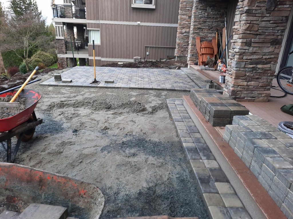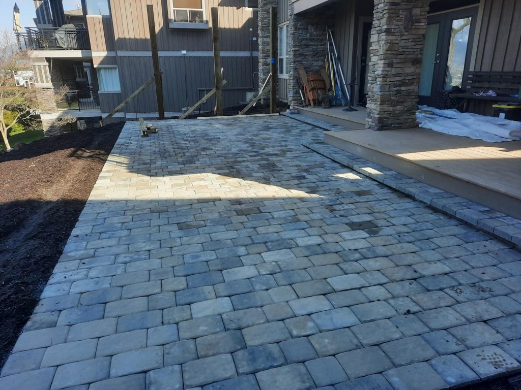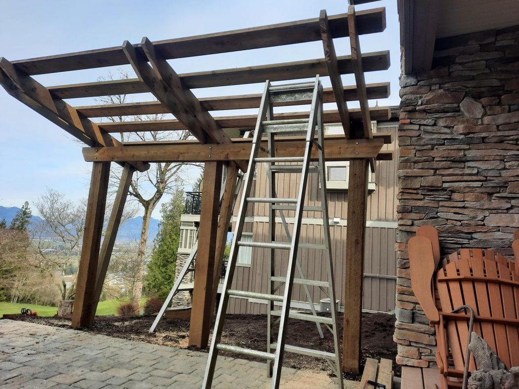 Challenging back yard renovation. We took a drab and uninviting space and transformed it into a large functional patio complete with a cantilevered privacy screen and tabletop, a floating style bench and a swingset.